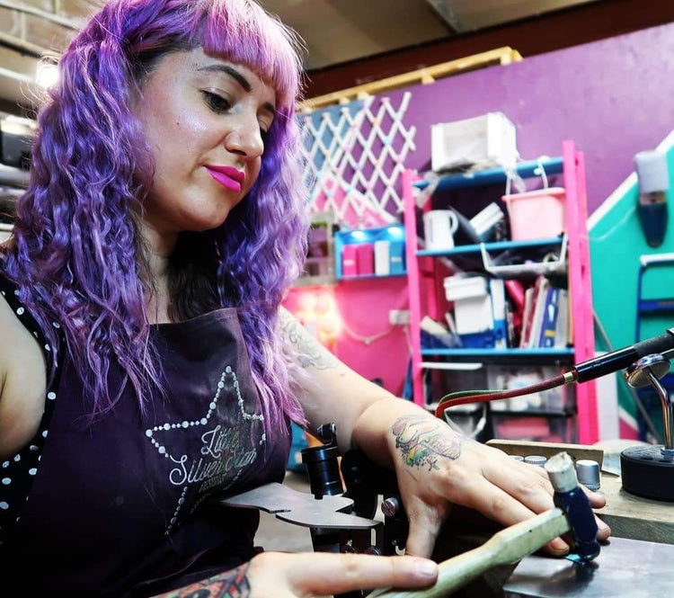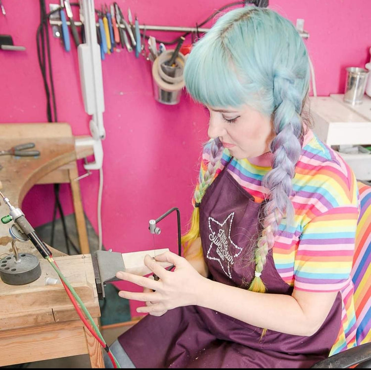 After studying Fashion and Textile Management at Nottingham Trent, I spent two years travelling, collecting beads and stones, and slowly shaping my craft. When my daughter arrived in 2014, I finally invested in the tools to move from beading into metalwork, and in 2014 Little Silver Star was born.